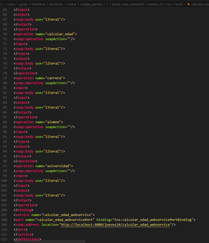 Types: Define los tipos de datos que se usan en los mensajes. Message: Describe las estructuras de los mensajes de entrada y salida. PortType: Agrupa las operaciones disponibles del servicio. Binding: Especifica el protocolo y formato que se utiliza para comunicar (por ejemplo, SOAP). Service: Indica la dirección (URL) donde el servicio está disponible